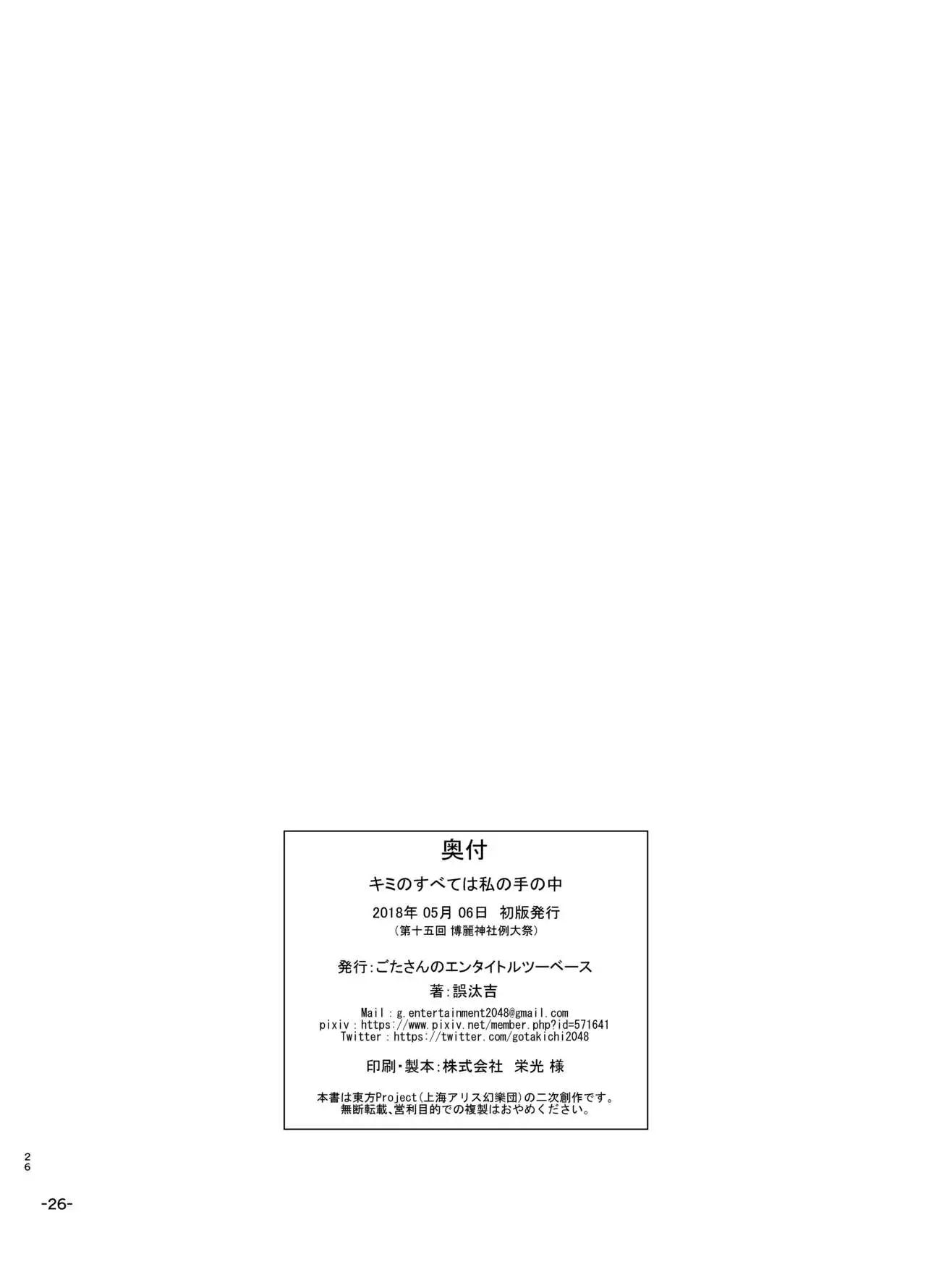 [Gotakichi's Entitled 2-base hit! (Gotakichi)] Kimi no Subete wa Watashi no Te no Naka (Touhou Project) [Digital] [ごたさんのエンタイトルツーベース (誤汰吉)] キミのすべては私の手の中 (東方Project) [DL版]