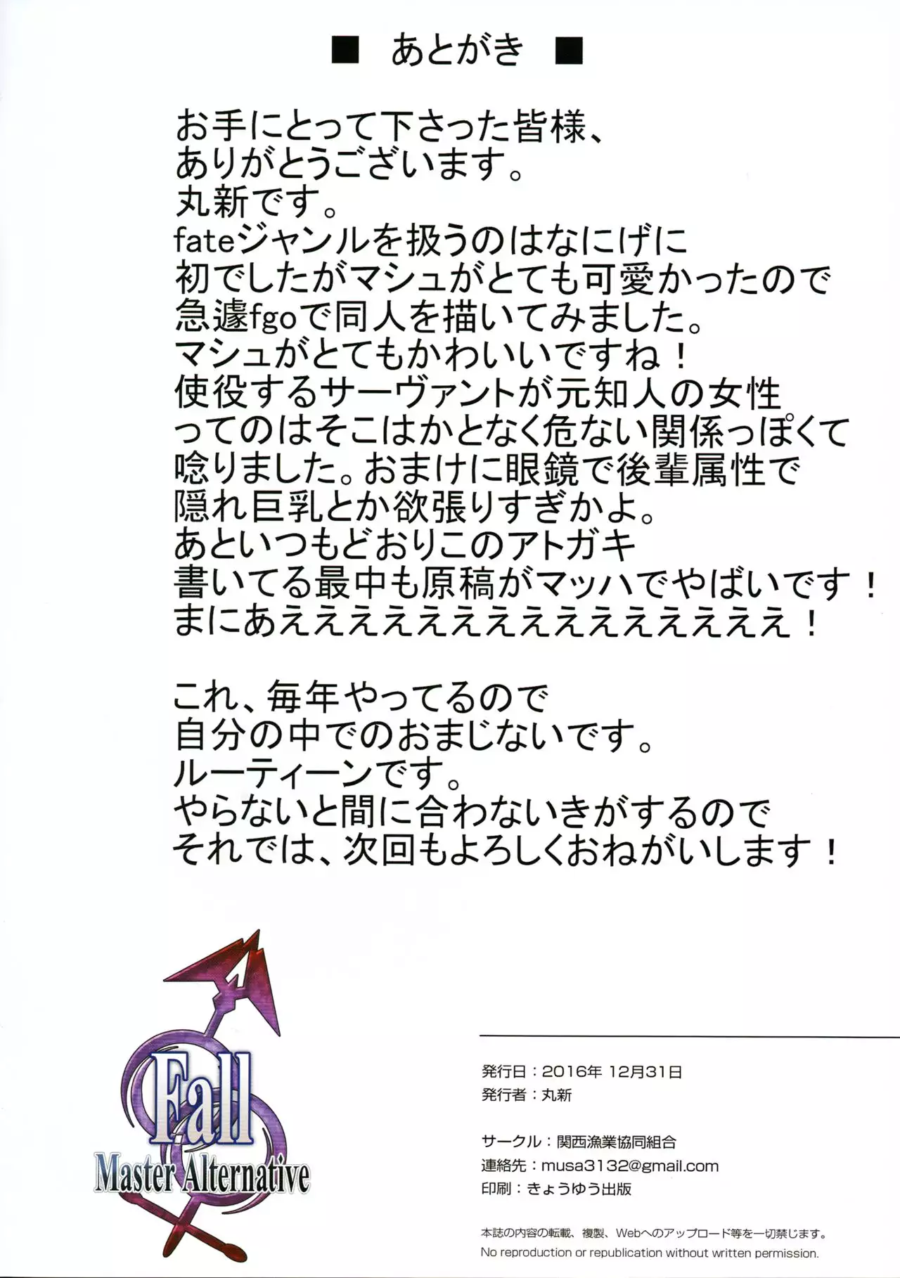 (C91) [Kansai Gyogyou Kyoudou Kumiai (Marushin)] Fall/Master Alternative (Fate/Grand Order)