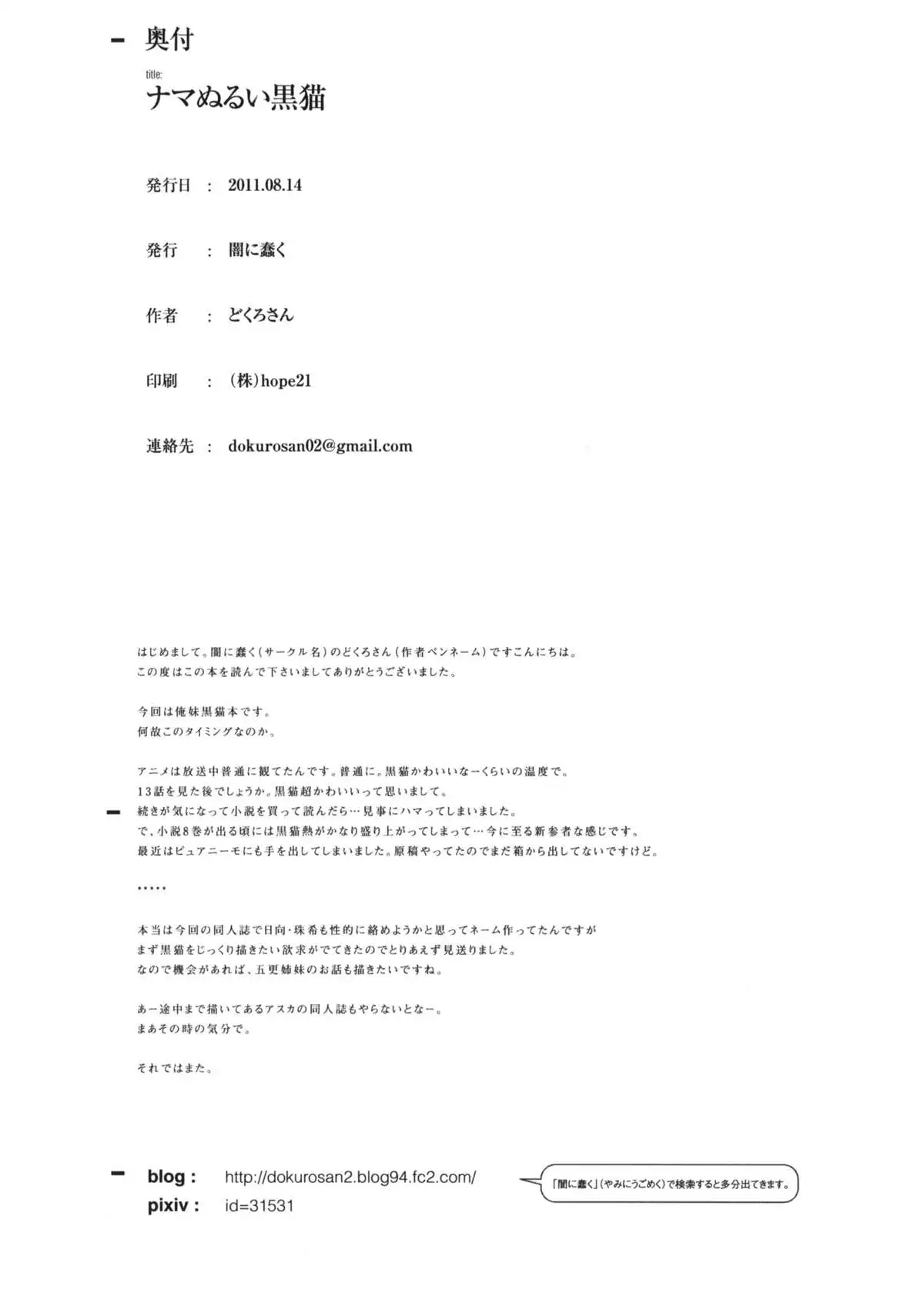 (C80) [Yami ni Ugomeku (Dokuro-san)] Namanurui Kuroneko +Paper (Ore no Imouto ga Konna ni Kawaii Wake ga Nai) (C80) [闇に蠢く (どくろさん)] ナマぬるい黒猫 +ペーパー (俺の妹がこんなに可愛いわけがない)