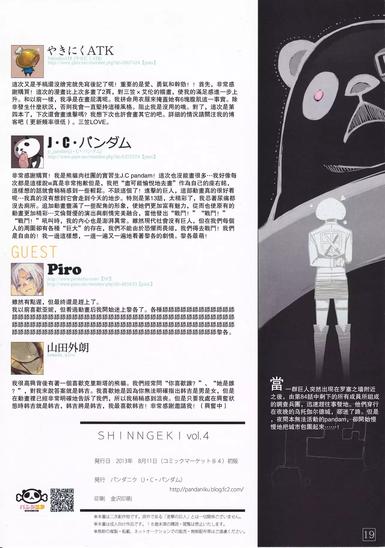 (C84) [PANDA-NIKU (Yakiniku ATK, J.C.Pandam)] SHINNGEKI vol. 4 (Shingeki no Kyojin) [Chinese] (C84) [パンダニク (やきにくATK、J・C・パンダム)] SHINNGEKI vol.4 (進撃の巨人) [中国翻訳]