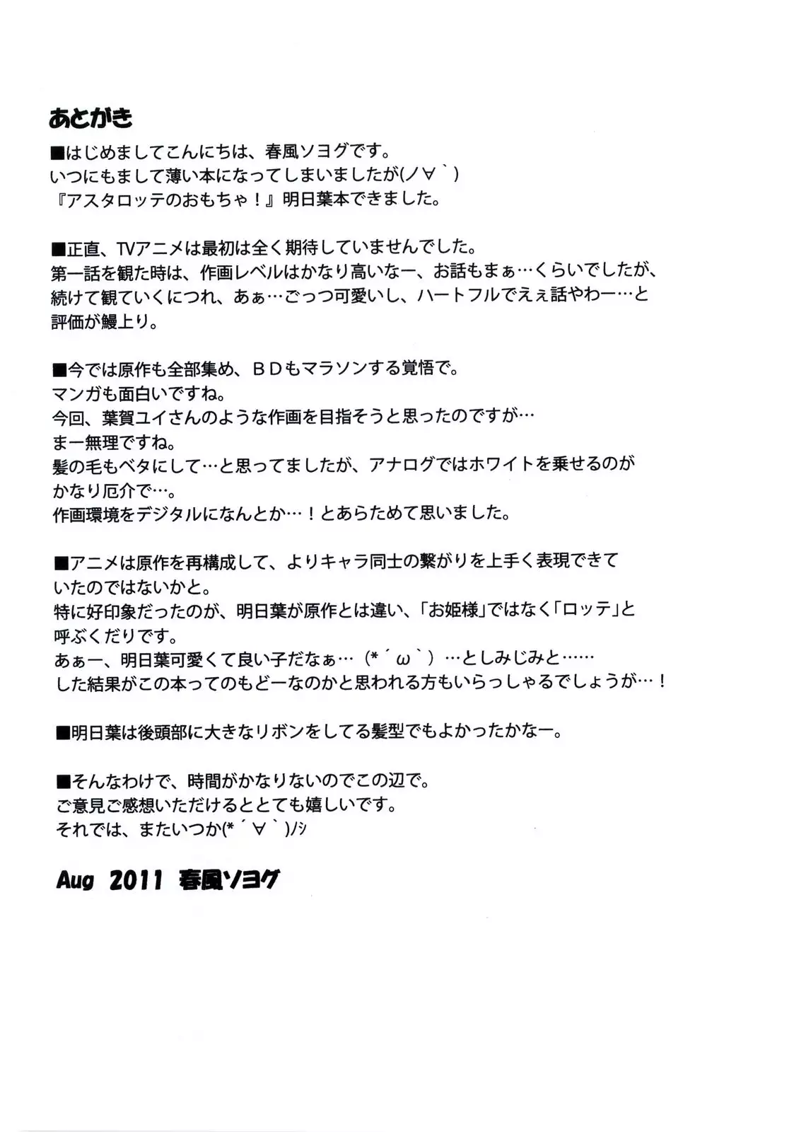(C80) [GUST (Harukaze Soyogu)] Asuhariet no Omocha o Chuu Chuu! (Lotte no Omocha!) [English] [Yoroshii]