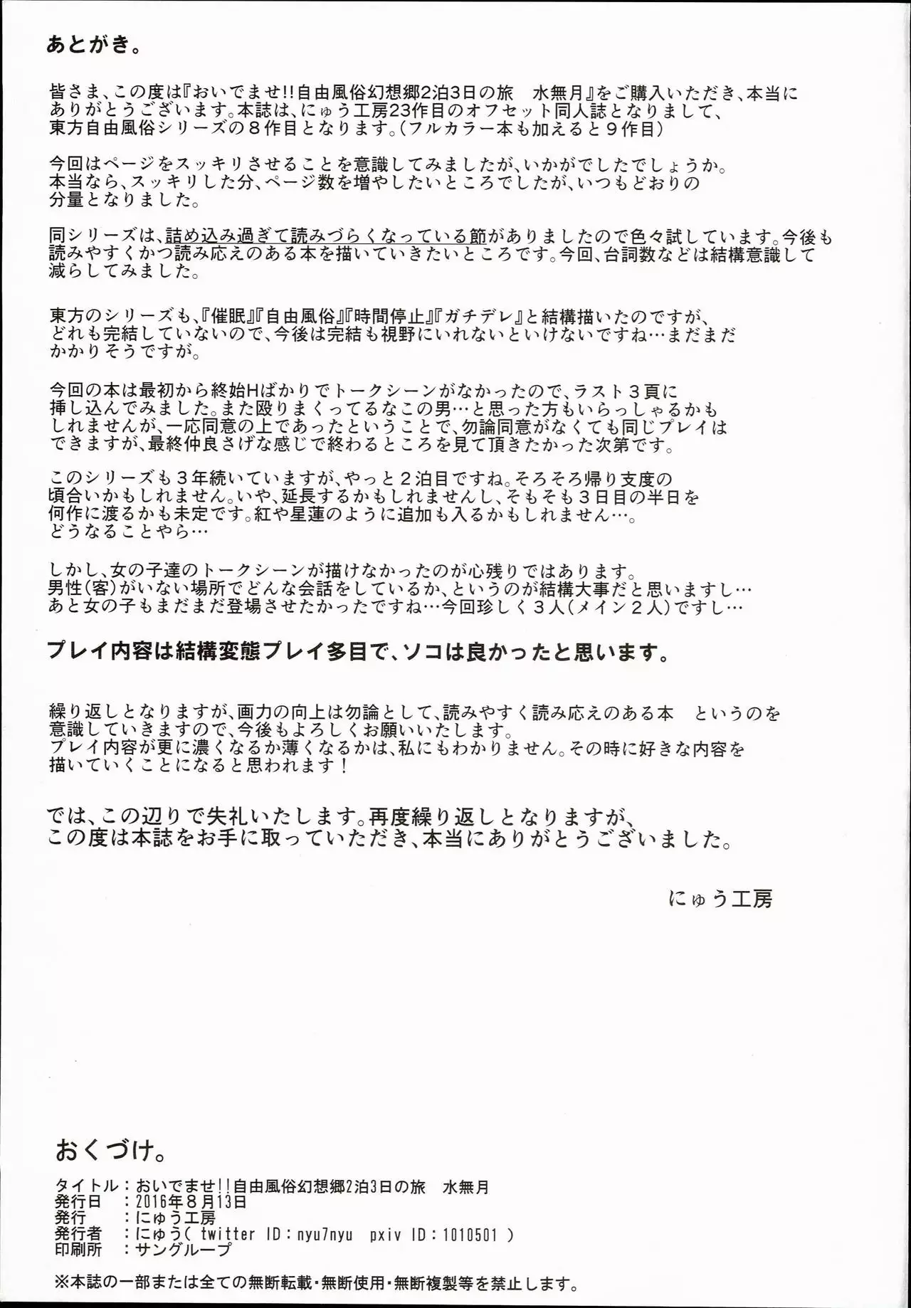(Daikyuushuu Touhousai 8) [Nyuu Koubou (Nyuu)] Oidemase!! Jiyuu Fuuzoku Gensokyo Nihaku Mikka no Tabi (Touhou Project)