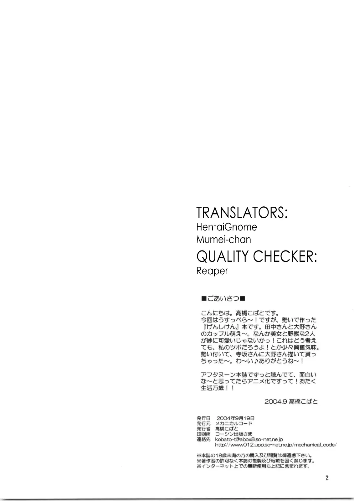 (SC25) [Mechanical Code (Takahashi Kobato)] Natsu no Owari | End of Summer (Genshiken) [English] [Mumei-TL] (サンクリ25) [メカニカルコード (高橋こばと)] ナツノオワリ (げんしけん) [英訳]