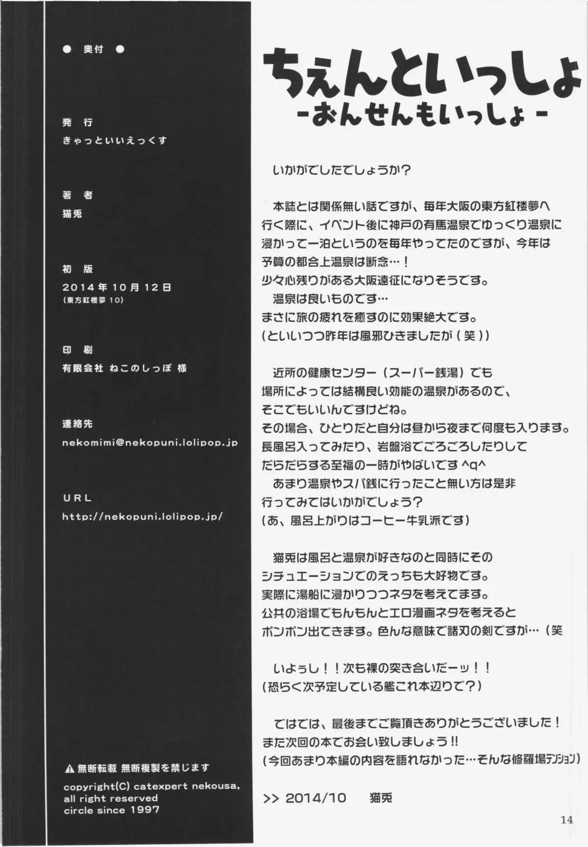 (Kouroumu 10) [Cat Expert (Nekousa)] Chen to Issho -Onsen mo Issho- (Touhou Project) (紅楼夢10) [きゃっといいえっくす (猫兎)] ちぇんといっしょ -おんせんもいっしょ- (東方Project)