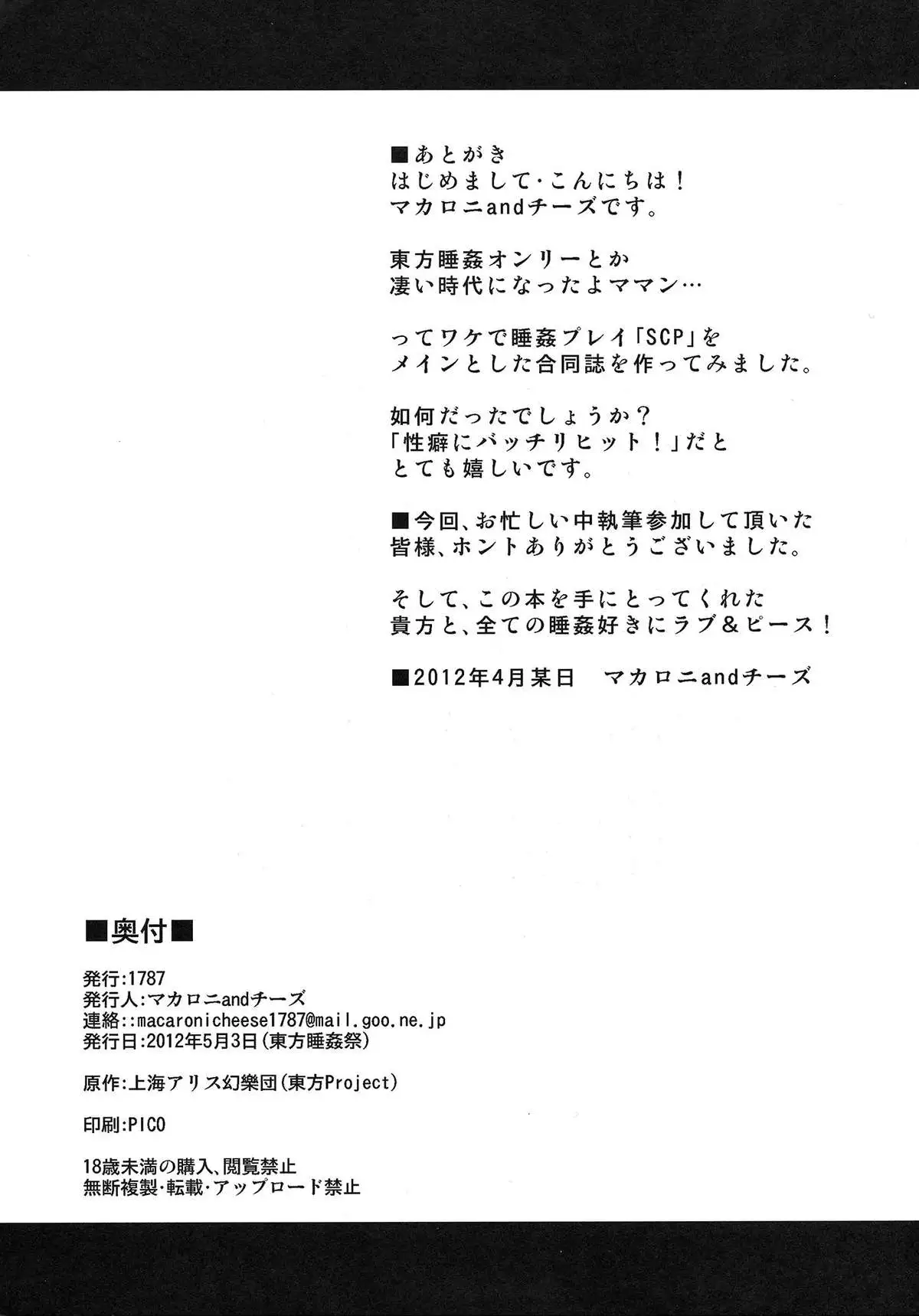 (Touhou Suikansai) [1787 (Macaroni and Cheese etc)] Suikan Chakui Paizuri Goudoushi LOVE SCP (Touhou Project) (東方睡姦祭) [1787 (マカロニandチーズ 他)] 睡姦着衣パイズリ合同誌 LOVE SCP (東方Project)